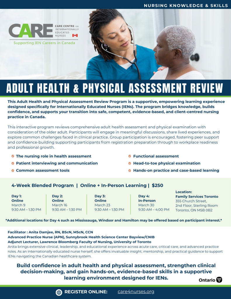 This Adult Health and Physical Assessment Review Program is a supportive, empowering learning experience designed specifically for Internationally Educated Nurses (IENs). The program bridges knowledge, builds confidence, and supports your transition into safe, competent, evidence-based, and client-centred nursing practice in Canada.