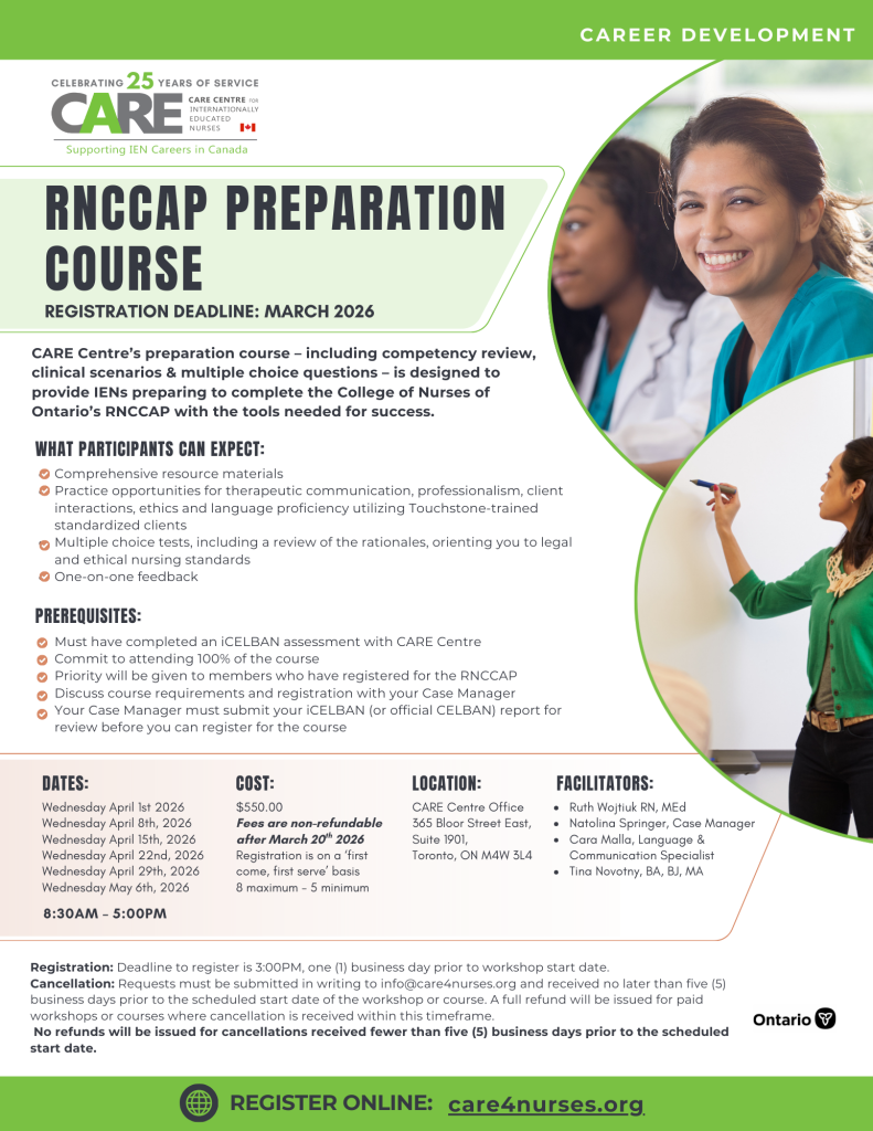 CARE Centre for Internationally Educated Nurses presents: CARE Centre’s preparation course – including competency review, clinical scenarios & multiple choice questions – is designed to provide IENs preparing to complete the College of Nurses of Ontario’s RNCCAP with the tools needed for success. Wednesday April 1st 2026Wednesday April 8th, 2026Wednesday April 15th, 2026Wednesday April 22nd, […]