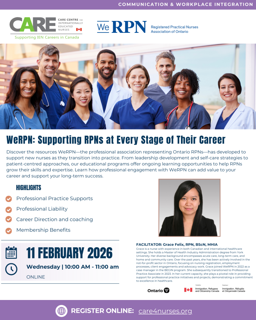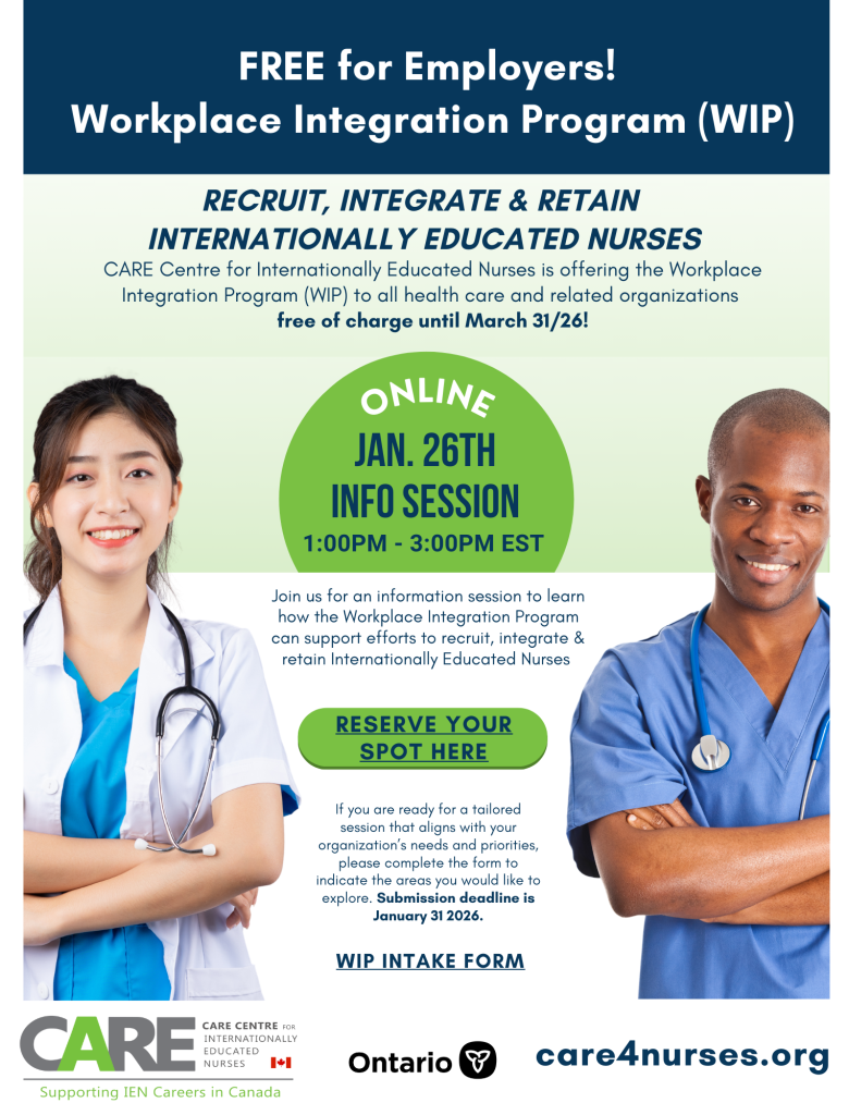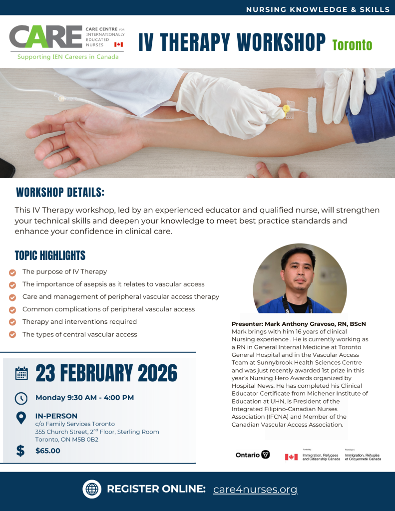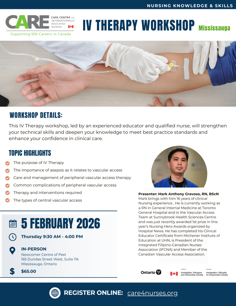 Login Register Sign Out CARE Centre for Internationally Educated Nurses presents: Additional Details This IV Therapy workshop, led by an experienced educator and qualified nurse, will strengthen your technical skills and deepen your knowledge to meet best practice standards and enhance your confidence in clinical care. IN-PERSON Newcomer Centre of Peel165 Dundas Street West, Suite […]