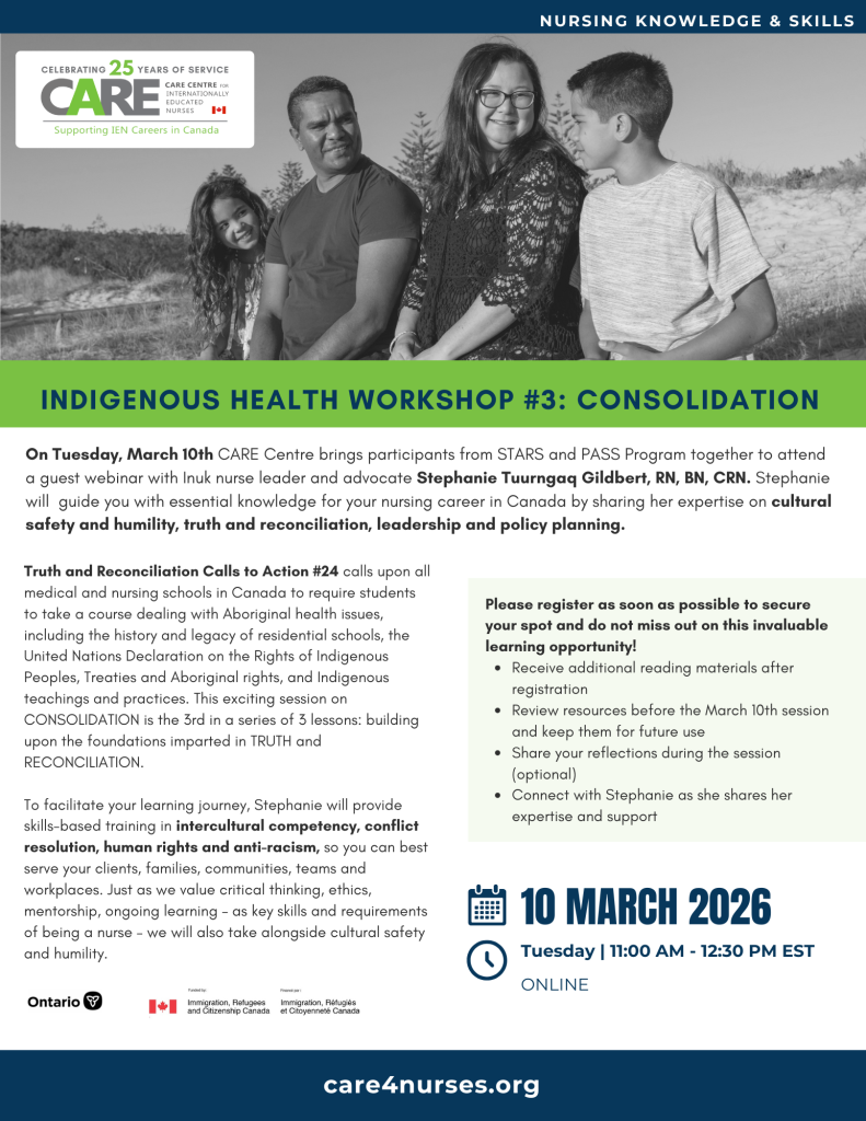 On Tuesday, March 10th CARE Centre brings participants from STARS and PASS Program together to attend a guest webinar with Inuk nurse leader and advocate Stephanie Tuurngaq Gildbert, RN, BN, CRN. Stephanie will guide you with essential knowledge for your nursing career in Canada by sharing her expertise on cultural safety and humility, truth and reconciliation, leadership and policy planning.