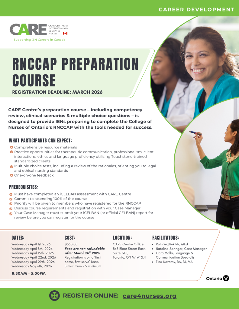 CARE Centre’s preparation course – including competency review, clinical scenarios & multiple choice questions – is designed to provide IENs preparing to complete the College of Nurses of Ontario’s RNCCAP with the tools needed for success.